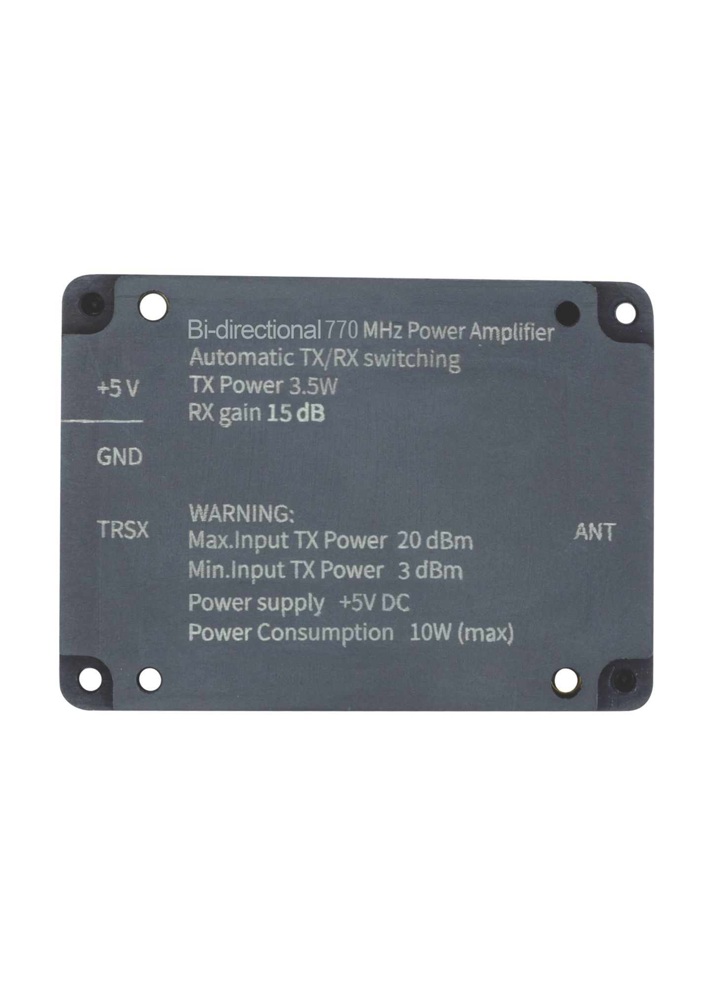 The RigExpert 770 MPA-LD is a compact, bi-directional RF signal amplifier designed for integration into 5V-powered systems. It operates in the 740–810 MHz frequency range and features automatic VOX-based switching between transmit and receive modes with adjustable sensitivity. This makes it ideal for UAVs, SDR, IoT applications, and both professional and amateur radio systems. Applications •UAV signal transmission •Software-defined radio (SDR) •IoT devices •Amateur and professional radio communication •Laboratory and testing equipment