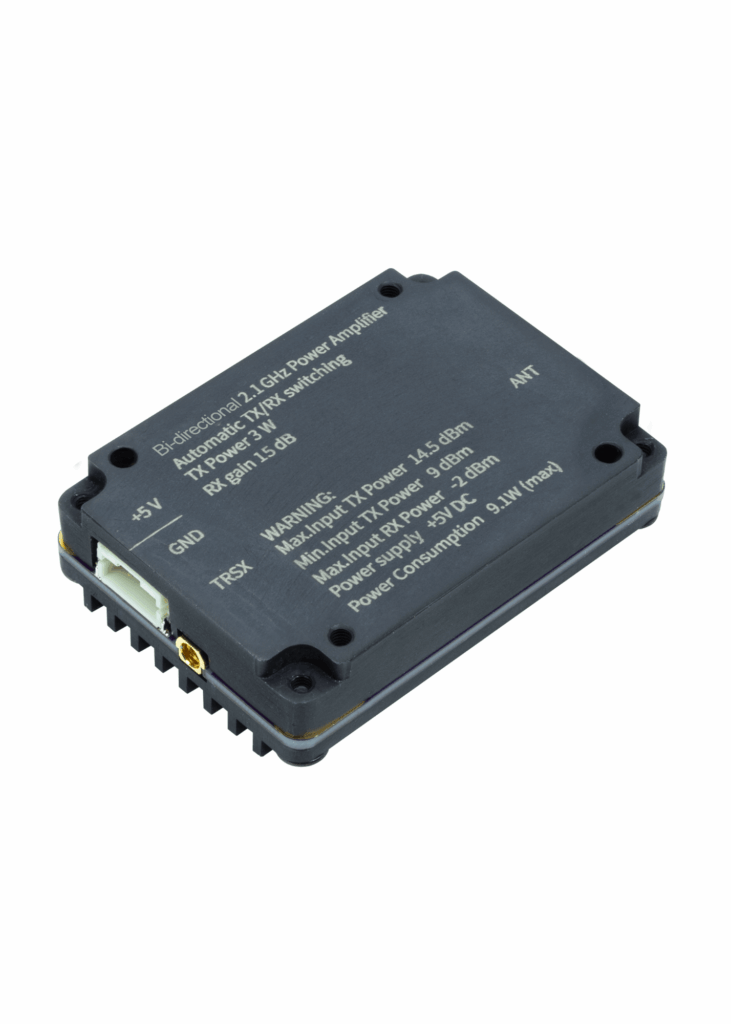 2.1GPA-LD — це двонаправлений ВЧ підсилювач, оптимізований для роботи в частотному діапазоні 2110–2200 МГц. Завдяки автоматичному перемиканню між режимами прийому і передачі (VOX), компактним габаритам і живленню від 5В, пристрій ідеально підходить для БПЛА, SDR, IoT, аматорського радіо та лабораторних систем.