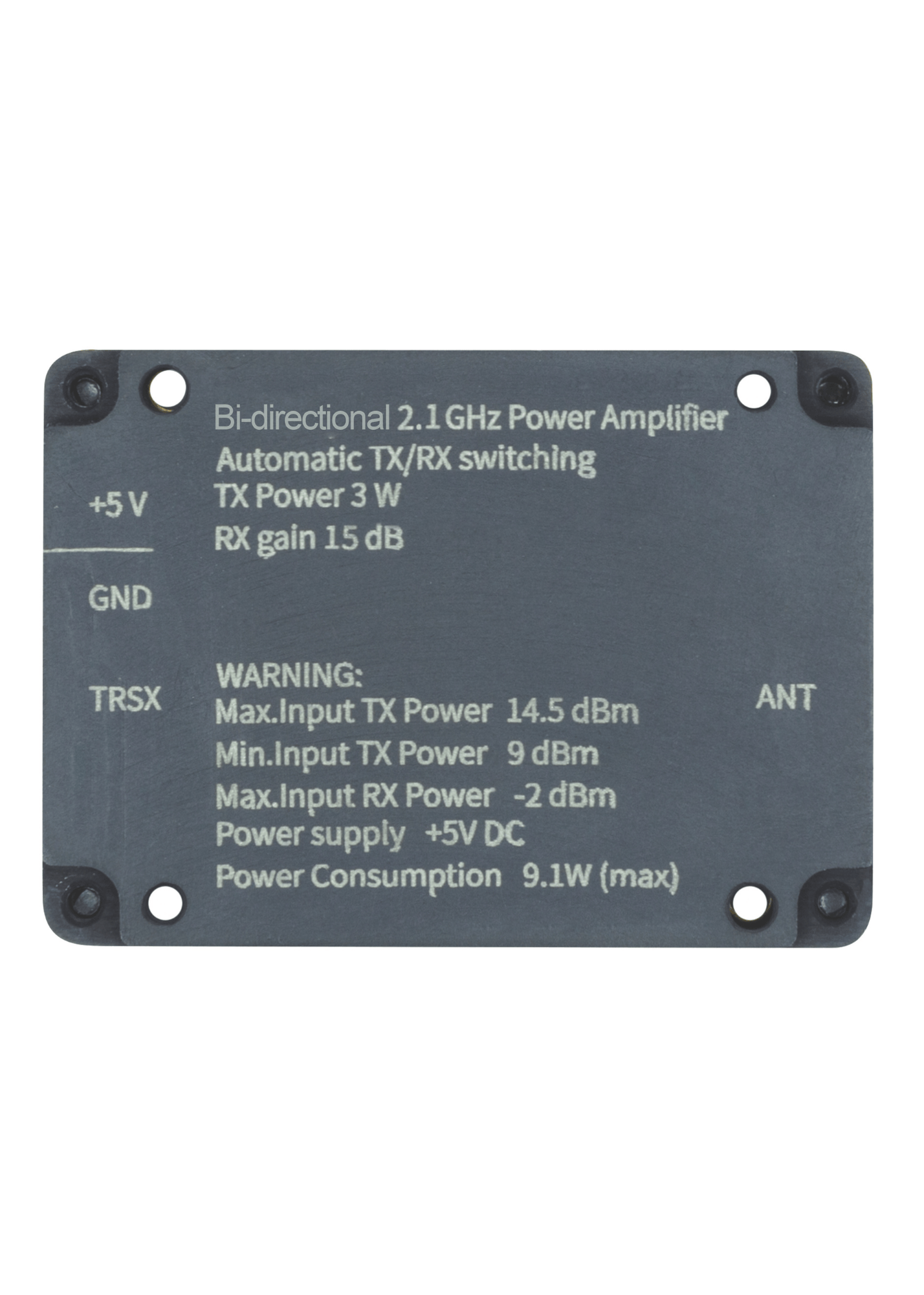 Підсилювач забезпечує 15 dB посилення на передачу, 12 dB на прийом, вихідну потужність до 2.85 Вт (Pulse) або 2.58 Вт (CW), і має захист від електростатичних розрядів (ESD) та пасивне охолодження. Оснащений зручними MMCX-роз’ємами, він легко інтегрується в малі системи зв’язку або тестові стенди.